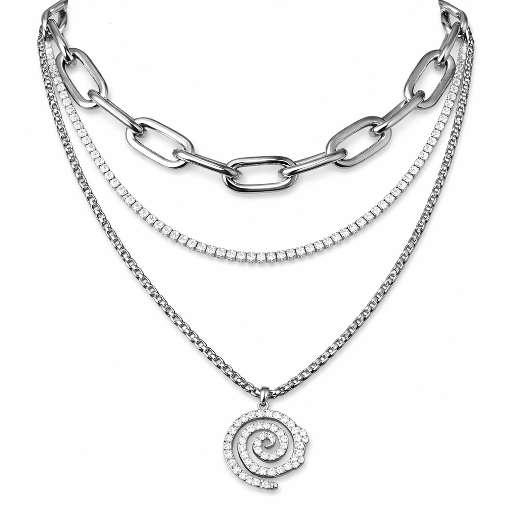 The bold link chain defines the neckline, the tennis layer adds a continuous refined shine, and the Viola pendant anchors the entire look with intention.
